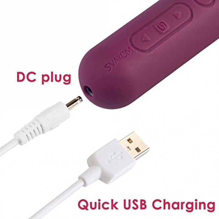 Package Includes - SVAKOM Siime USB Rechargerable Video Camera Vibrator, Velvet Dust Bag, Instruction Card, Warning, Certification Description, Warranty Card and USB Charge Cable.